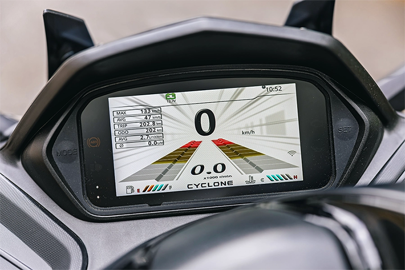 El seu motor de 289 cc respon amb suavitat i potència, recolzat pel sistema de frens ABS Bosch per a una seguretat sense fissures. La pantalla TFT amb Mirror Link, el sistema Keyless i els comandaments retroiluminados reforcen la sensació de control intuïtiu i connectivitat.